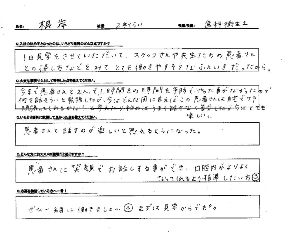 治療のお話はもちろん、私は表情筋、食育などお口にまつわる様々な知識も得てきましたので、色々なお話を通して、少しでもお口への興味・関心が湧いたら嬉しく思います。